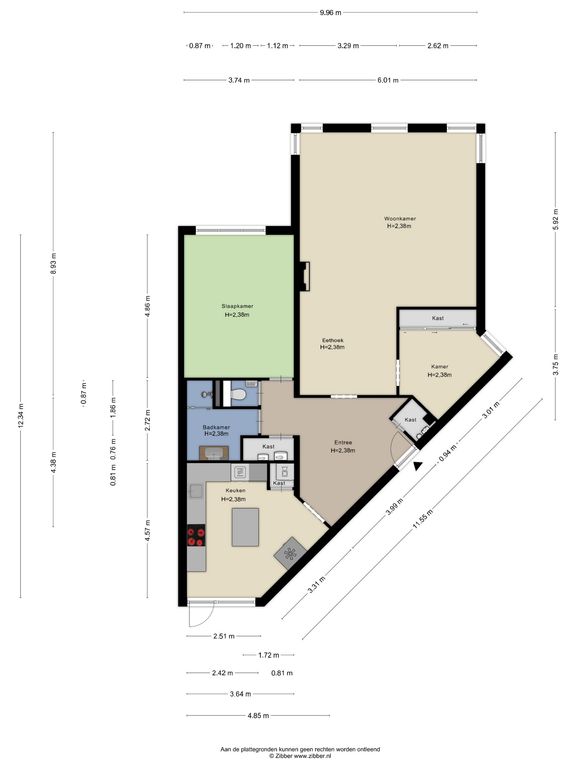 Royale entree (3,99 breed) met kast en stookruimte. Woonkamer (8,93 / 5,92 x 6,01) met veel ruimte en een elektrische haard. Slaapkamer (4,86 x 3,74) met airco. Slaap-, werk- of logeerkamer (3,66 x 3,01). Badkamer (3,74 x 2,72) met regendouche en badkamermeubel met wastafel. Apart toilet. Keuken (4,85 x 4,57) met veel inbouwapparatuur zoals o.a. inductie kookplaat, groepenkast elektra (2022), stoomoven, vriezer, Bora downdraft afzuiger, vaatwasser en Quooker en wasmachine- en drogeraansluiting. Vanuit de keuken heeft u toegang tot de achtertuin op het zuiden.